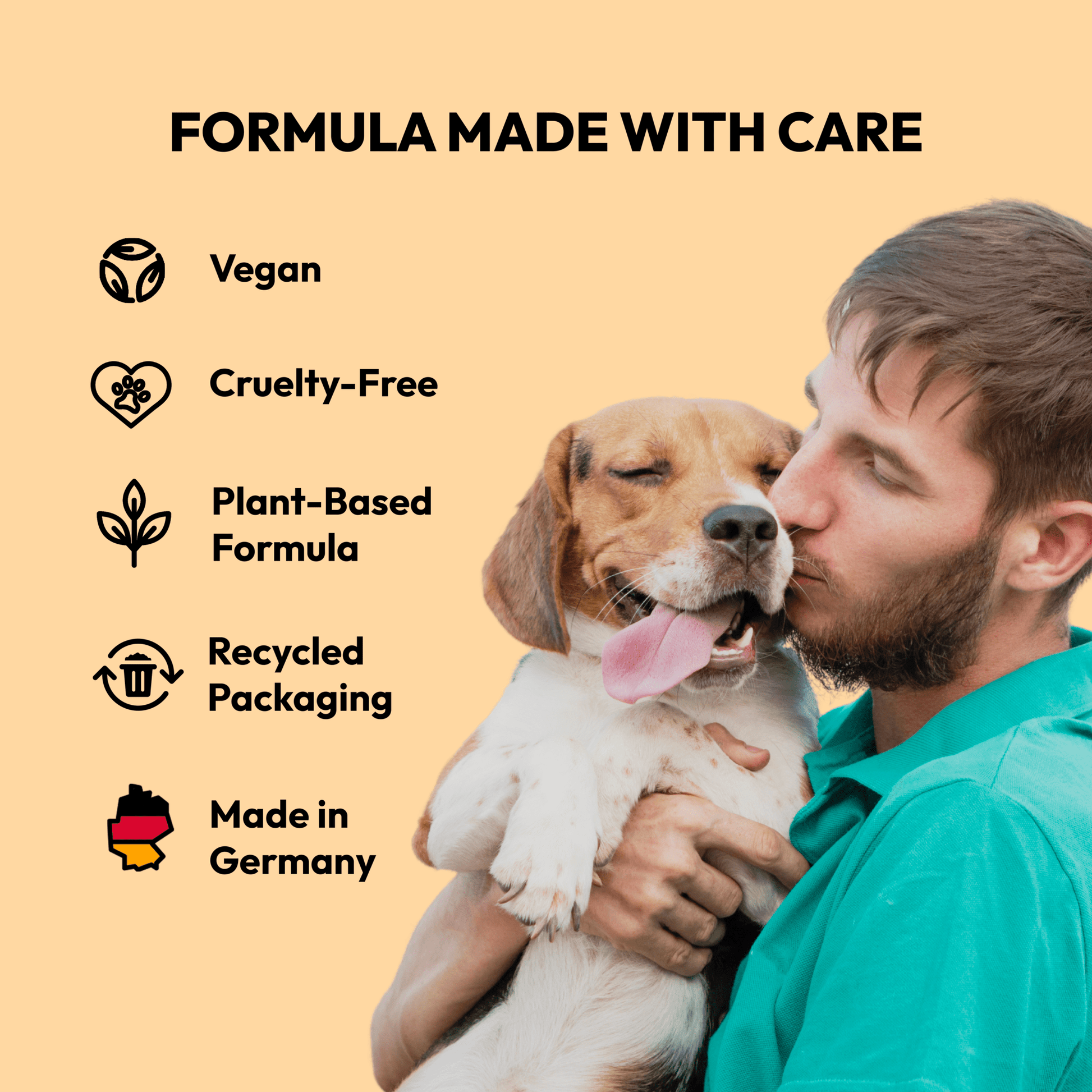 Des ingrédients naturels tels que le beurre de karité et l'aloe vera hydratent la peau et assurent un pelage brillant et doux sans dégraisser la peau et sans détruire son pH naturel.