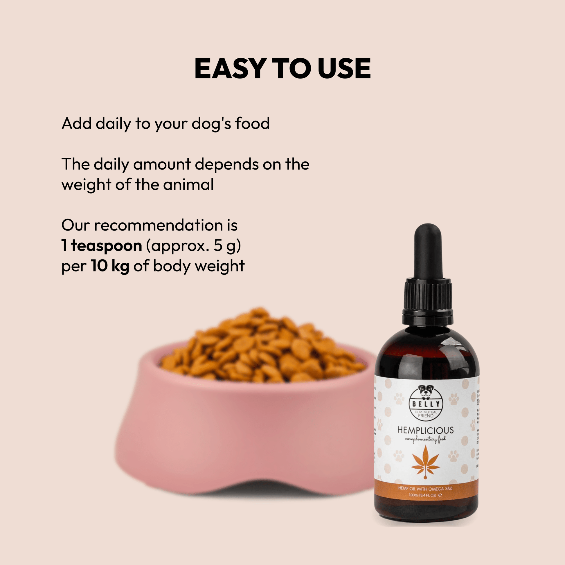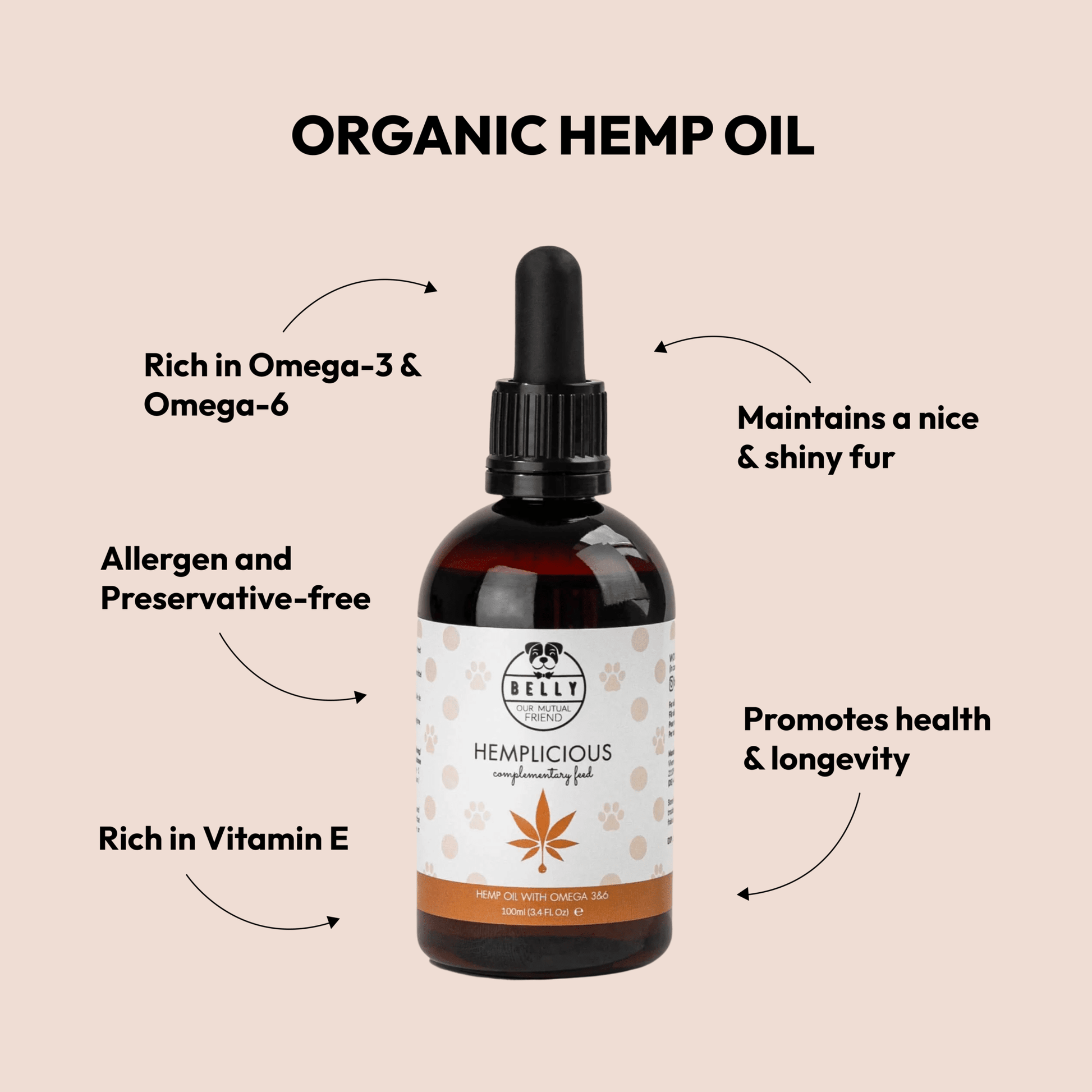 HEMPLICIOUS is an organic hemp seed oil, rich in Omega-3 and 6, this complementary feed helps your four-legged friend maintain beautiful fur & strong joints. The vitamin E found in Hemp oil is also known for its antioxidant power.