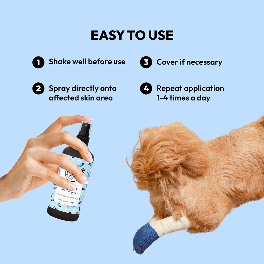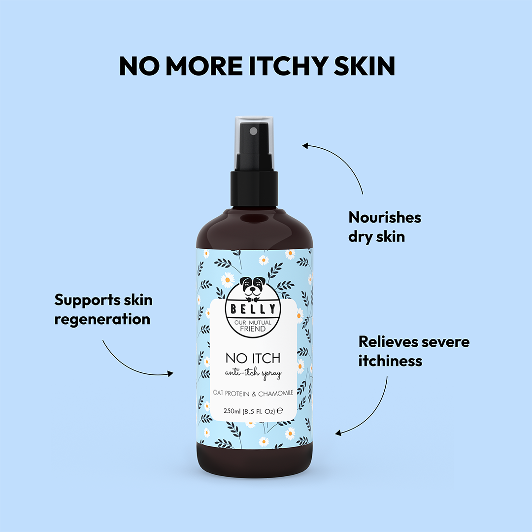 No Itch spray helps reduce itchy feelings caused by dry skin, parasites bites and irritations. Oat Protein & Chamomile help to nourish and calm the skin.